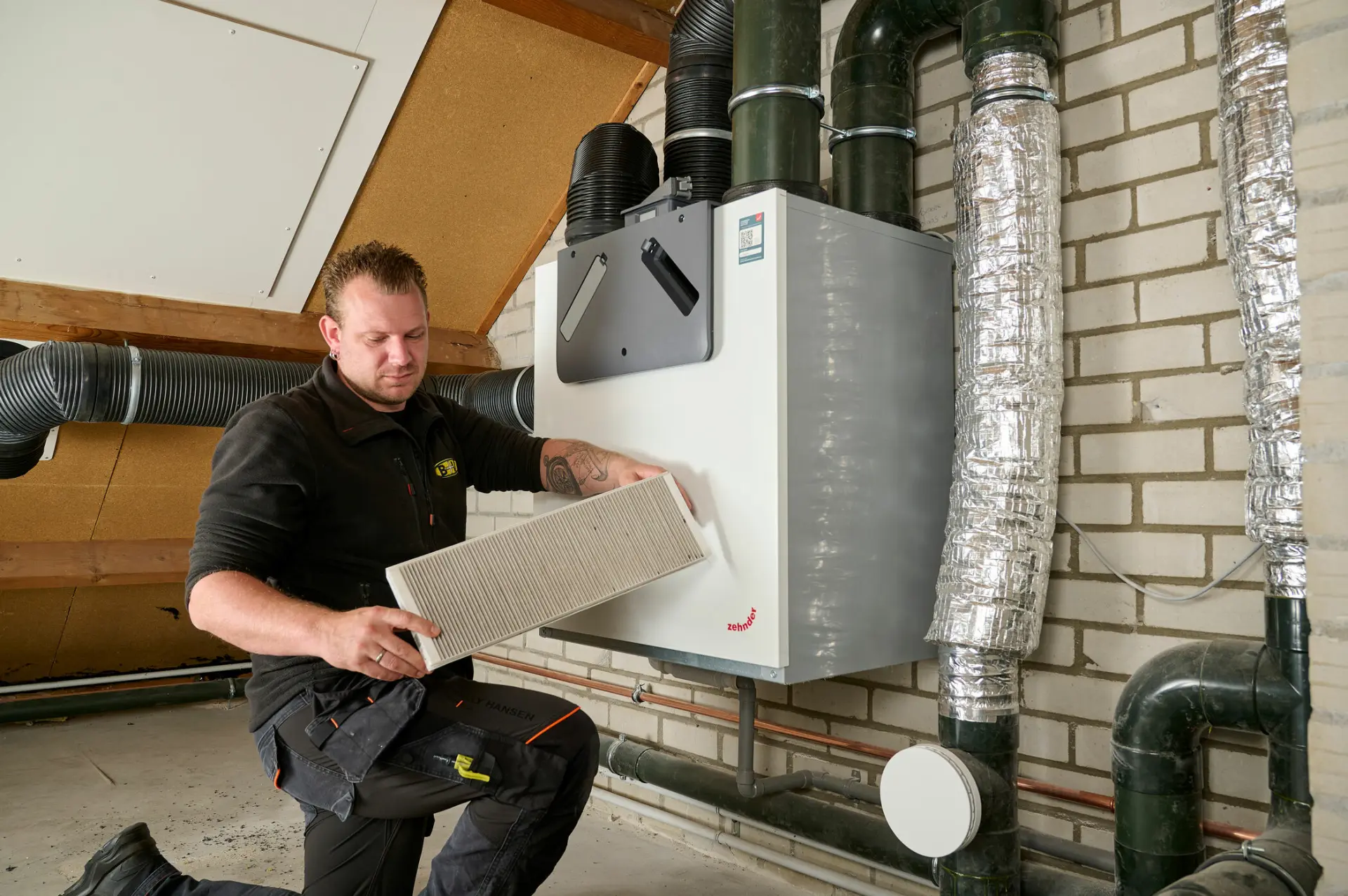 Een WTW-installatie voert op een slimme manier warme, vervuilde lucht af en haalt tegelijkertijd frisse buitenlucht naar binnen. Dankzij een warmtewisselaar wordt de inkomende lucht voorverwarmd met de warmte uit de afgevoerde lucht. Het resultaat? Een continu frisse luchtstroom in huis, zonder onnodig warmteverlies. Dit systeem draagt bij aan een energiezuinige en gezonde woning.